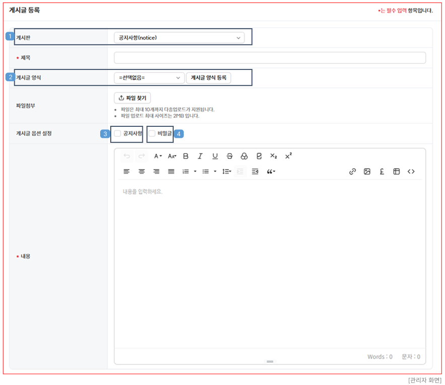 ① 게시판 : 게시판을 선택하여 게시글을 작성할 수 있습니다. 각 게시판별 설정된 값에 따라 작성 항목이 다르게 노출됩니다.