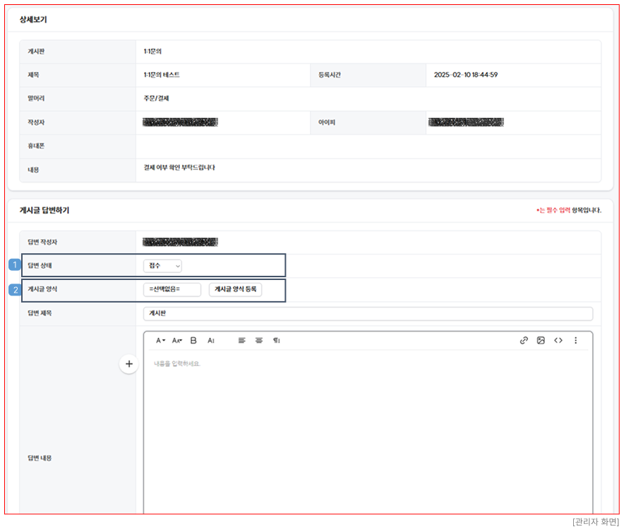 - 선택한 게시판의 게시글 답변을 등록할 수 있습니다.