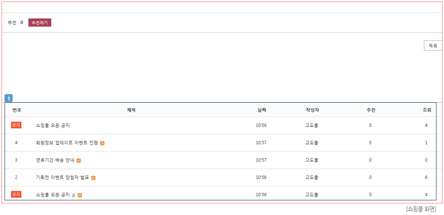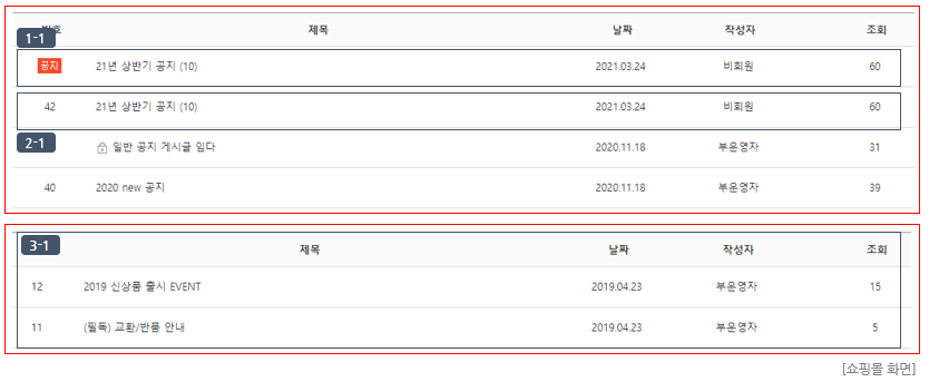 ① 게시판 등록 시 입력된 게시판명은 쇼핑몰 화면에 노출됩니다