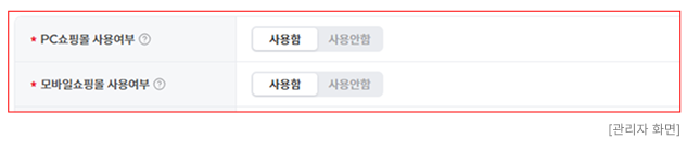 - "PC쇼핑몰", "모바일쇼핑몰"의 노출 여부를 각각 설정할 수 있습니다.