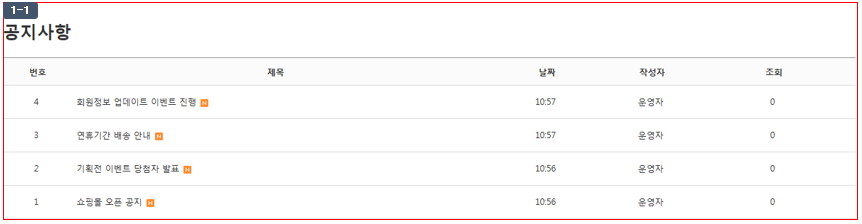 - 회원 정보 항목에 닉네임이 등록되어 있지 않을 경우 쇼핑몰 화면 게시판 리스트에서 작성자 표시 부분이 회원이름으로 노출됩니다.