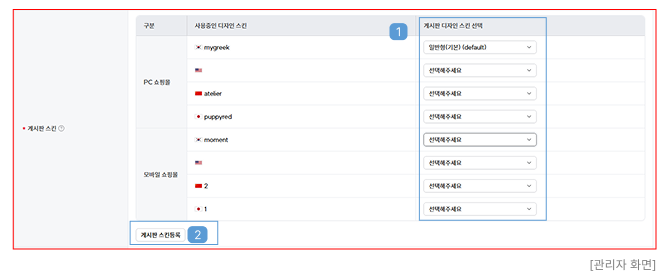 ① 사용중인 디자인 스킨별로 게시판 스킨을 선택할 수 있습니다.