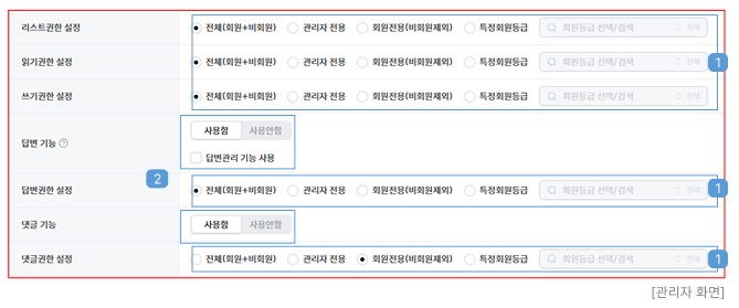 ② 기능 사용 설정 : 답변, 댓글 기능의 사용 여부를 설정할 수 있습니다.