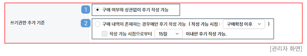 - 작성 가능 시점으로부터 1 ~ 30일 이내만 후기를 작성할 수 있도록 기간 설정이 가능합니다.