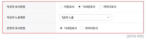 : 게시글 등록 시 작성자 표시방법을 설정할 수 있습니다. 회원가입 시 등록된 정보(이름 / 닉네임 / 아이디)로 노출 설정합니다.