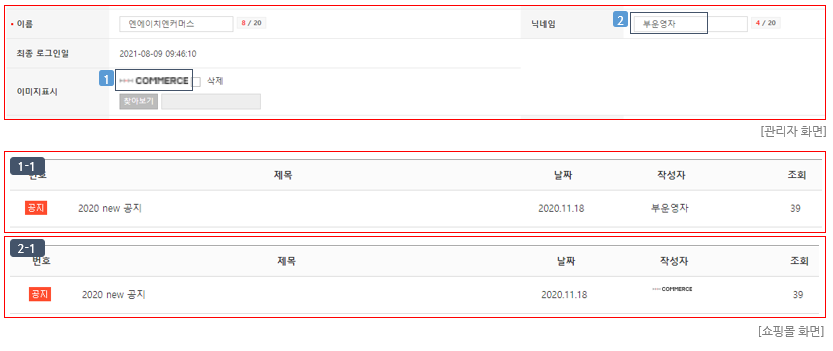 ① "닉네임표시" 선택 시 "기본설정 > 관리 정책 > 운영자 관리"에 입력된 닉네임이 이미지 (1-1)처럼 작성자 영역에 표시됩니다.