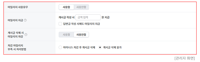 : 게시글을 등록한 회원에게 마일리지 지급 여부를 설정할 수 있습니다.