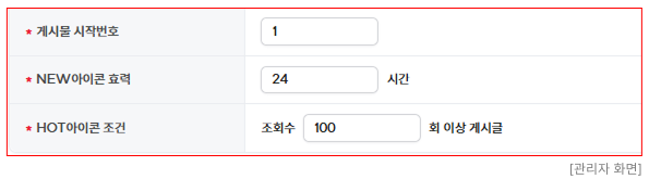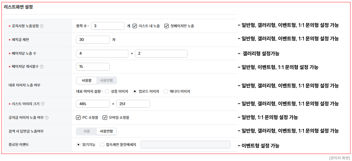 - 기본설정 중 필수 항목은 "쇼핑몰 사용여부, 유형, 아이디, 게시판명, 게시판 스킨" 입니다.