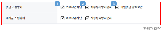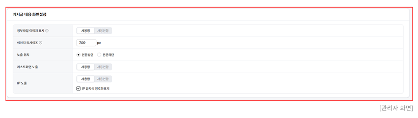 : 게시글에 작성자 IP 노출 여부를 설정을 할 수 있습니다. - IP 끝자리 암호화 표기 체크 시 "211.211.211.***" 로 표기됩니다.