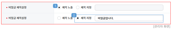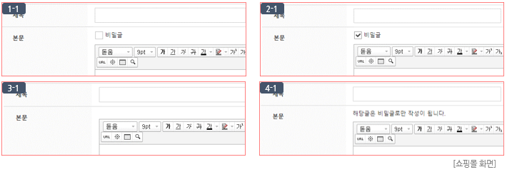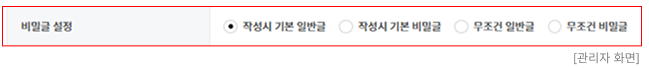 - 비밀글로 등록한 경우 권한 설정과 무관하게 관리자와 작성자만 읽기가 가능합니다. (단, 관리자 전용일 경우에는 관리자만 확인 가능합니다.)