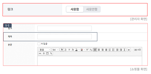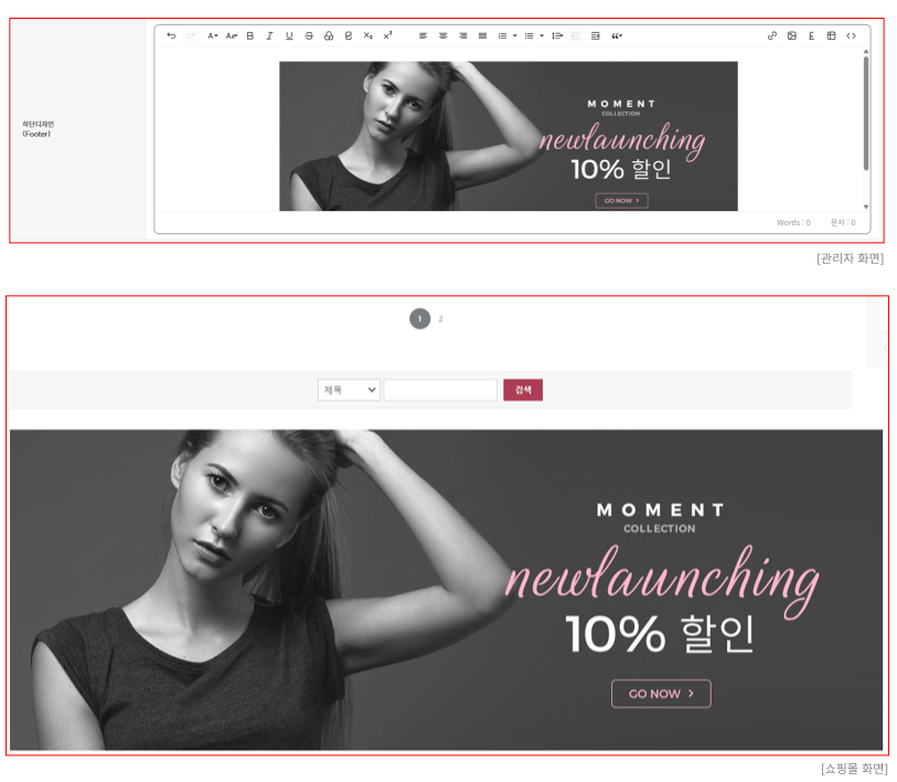 - 이미지 / 텍스트 등으로 꾸미기가 가능하며, 쇼핑몰 화면의 "게시판 리스트, 작성자 화면, 게시글" 등에 공통으로 노출됩니다.