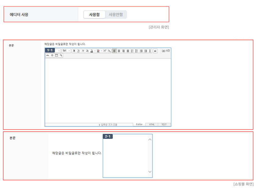 ① 에디터 "사용함" 설정 시 이미지 (1-1)과 같이 에디터를 사용 가능합니다.