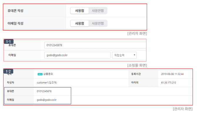 ① 휴대폰/이메일 작성을 "사용함"으로 설정 시, 게시글 작성 화면에 휴대폰/이메일 작성을 위한 필드가 추가됩니다. (이미지 (1-1))
