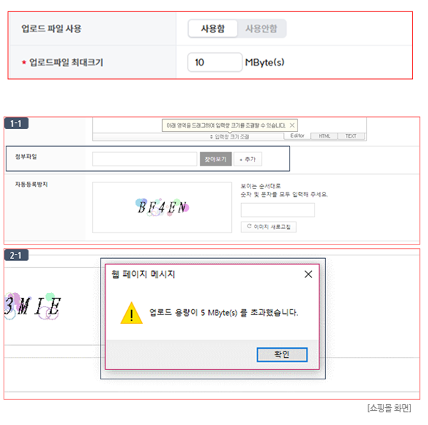 - 설정한 최대크기를 초과하여 업로드할 경우 경고창이 출력됩니다. (이미지 (2-1) 참고)