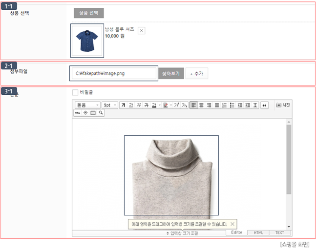 ② 에디터 "사용안함" 설정 시 이미지 (2-1)과 같이 에디터를 사용할 수 없고, 텍스트만 입력할 수 있습니다.