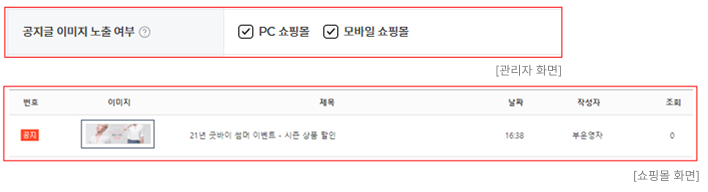 : 공지글에 등록된 이미지 노출 여부를 설정할 수 있습니다.