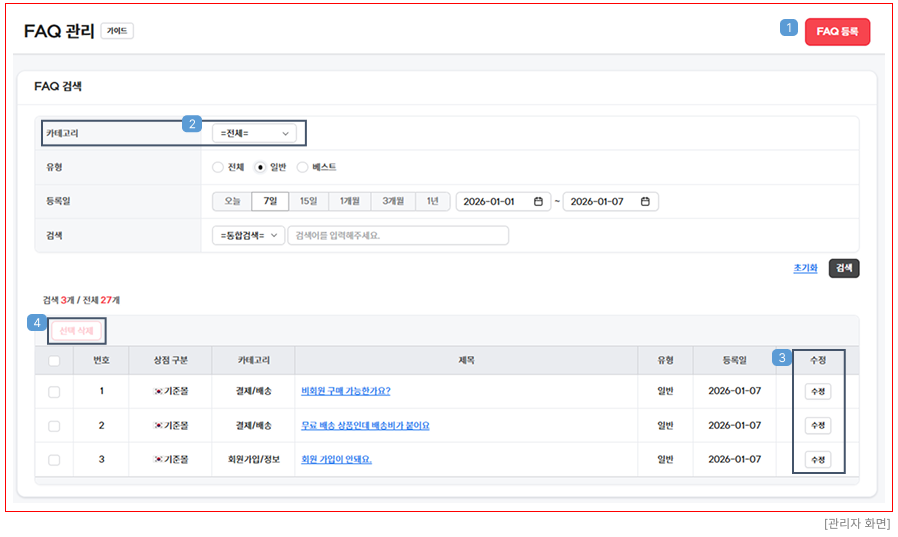 - 등록된 FAQ를 검색할 수 있으며, 수정/삭제할 수 있습니다.