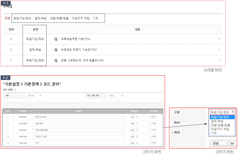 - FAQ 구분은 쇼핑몰 FAQ 상단 카테고리 및 리스트 분류 항목으로 노출됩니다. (이미지 (1-1) 참고)