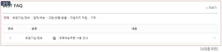 ② BEST FAQ로 등록 시, 쇼핑몰 화면의 "고객센터" 페이지에 노출되는 BEST FAQ에 해당 FAQ가 노출됩니다. (이미지 (2-1) 참고)