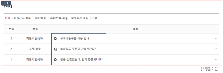 ③ 쇼핑몰 FAQ 리스트에 노출되는 FAQ 제목입니다. (이미지 (3-1) 참고)
