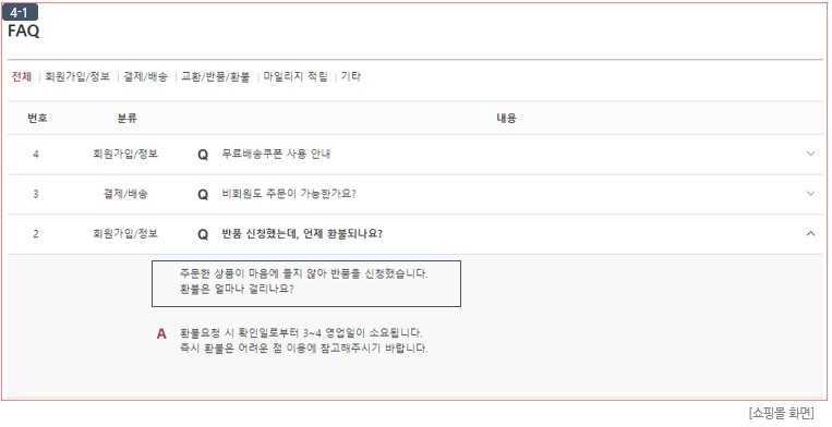 ④ 쇼핑몰 화면에서 FAQ 제목 클릭 시 확인할 수 있는 질문의 본문입니다. (이미지 (4-1) 참고)