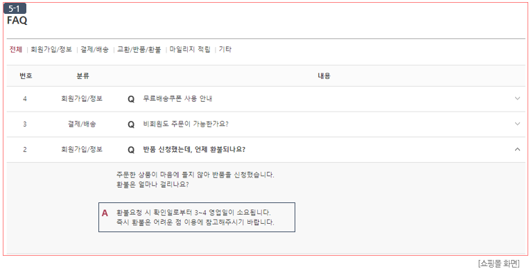 ⑤ 쇼핑몰 화면에서 FAQ 제목 클릭 시 확인할 수 있는 내용에 대한 답변입니다. (이미지 (5-1) 참고)