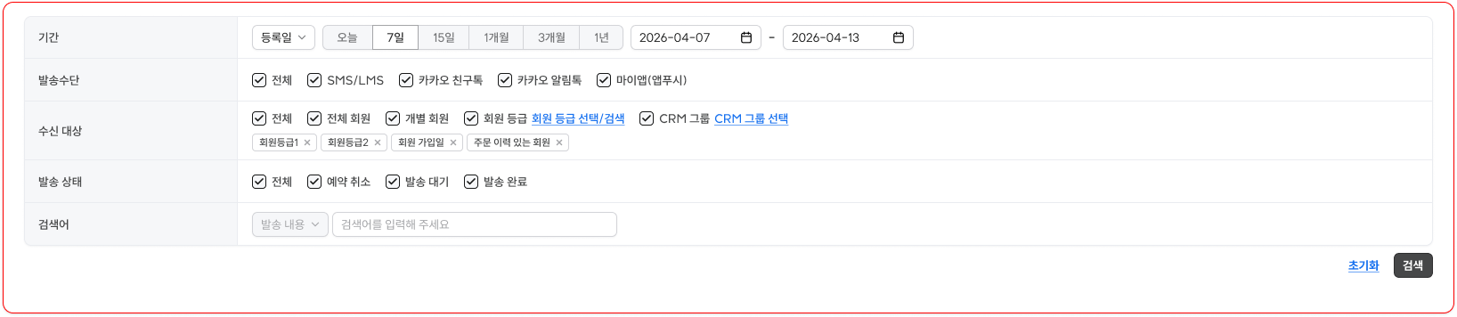 - 검색어 기준 검색 시, '발송 내용'으로만 검색할 수 있습니다.