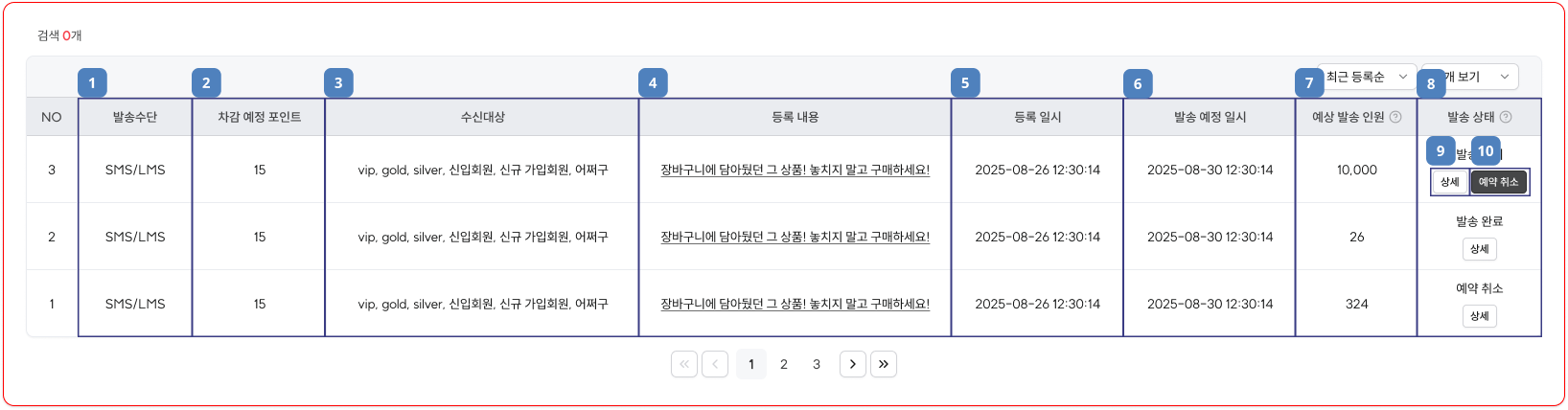 - 메시지 발송 > 모바일 메시지 발송에서 발송한 메시지 중 '예약 발송'건을 조회하고 관리할 수 있습니다.