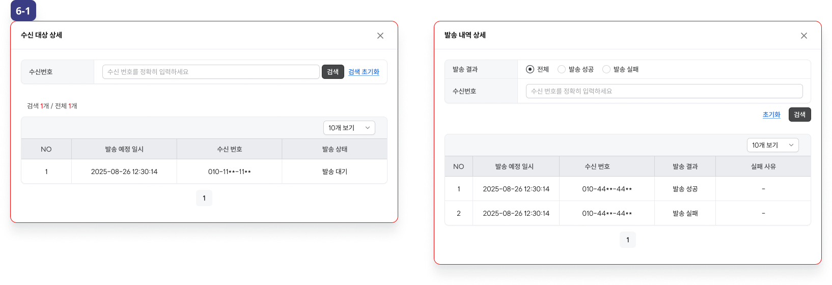 - 버튼을 클릭하면 실제 발송이 진행된 수신 대상 리스트를 팝업으로 제공합니다.