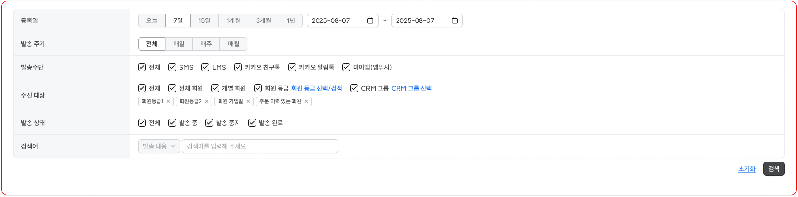 - CRM 그룹: 수신 대상을 'CRM 그룹'으로 설정한 경우 표시되며, 그룹 명도 함께 표시됩니다.