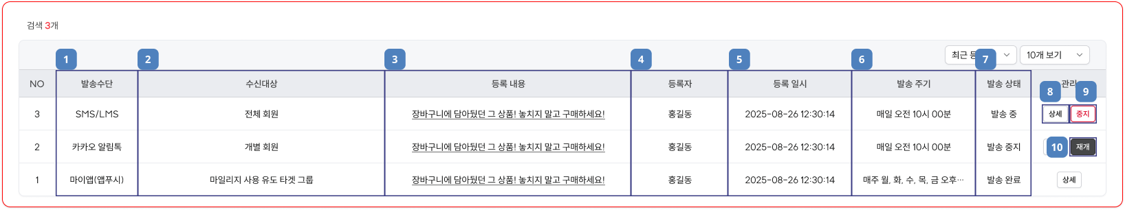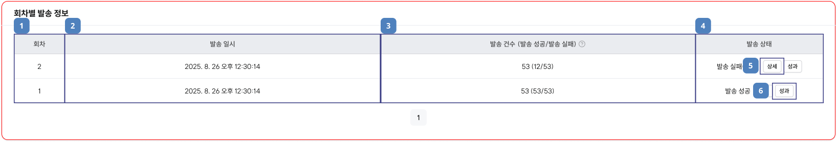 - 해당 반복 발송건의 각 회차별 실제 발송 결과를 확인할 수 있습니다.
