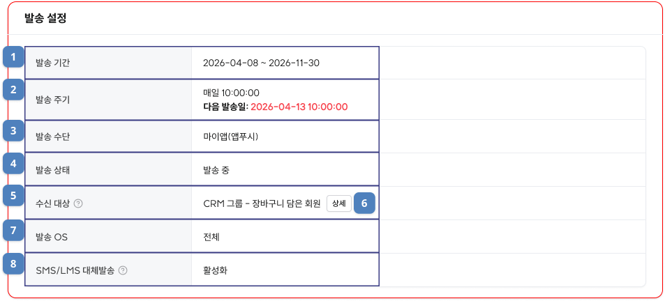 - 발송 완료: 설정한 반복 발송 종료일이 도래하여 발송이 완전히 중지된 상태입니다. 다시 발송할 수 없습니다.
