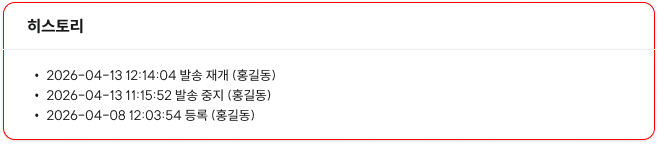 - 메시지를 반복 발송으로 등록했을 때, 발송 중지 또는 재개되었을 때가 기록되어 메시지 관련 히스토리를 확인할 수 있습니다.