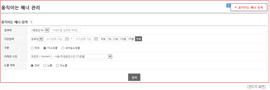 : 등록된 움직이는 배너의 구분에 따라 "전체 / PC쇼핑몰 / 모바일쇼핑몰" 중 선택하여 검색이 가능합니다.