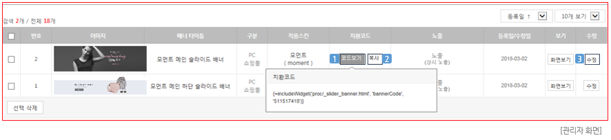 : 검색된 움직이는 배너 확인 및 수정이 가능하고 해당 배너의 치환코드를 확인할 수 있습니다.