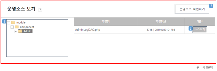 ① 폴더 또는 파일 선택 : 내용을 확인할 파일이 포함된 폴더를 선택하면 폴더 내 포함된 파일이 우측에 노출됩니다. ② 소스보기 : 이미지(2-1)과 같이 선택한 파일의 소스를 확인할 수 있습니다. 상단에 "운영"이라는 표시가 노출되어 원본소스임을 확인할 수 있습니다.