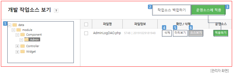 ② 작업소스 백업하기 : 아래 리스트에서 선택한 파일을 이용중인 컴퓨터에 압축하여 저장합니다. ③ 운영소스에 적용 / 적용하기 : 작업중인 소스를 운영소스에 적용합니다.
