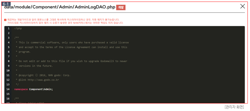 ⑥ 소스보기 : 이미지(6-1)과 같이 선택한 파일의 소스를 확인할 수 있습니다. 상단에 "개발"이라는 표시가 노출되어 개발중인 소스임을 확인할 수 있습니다.