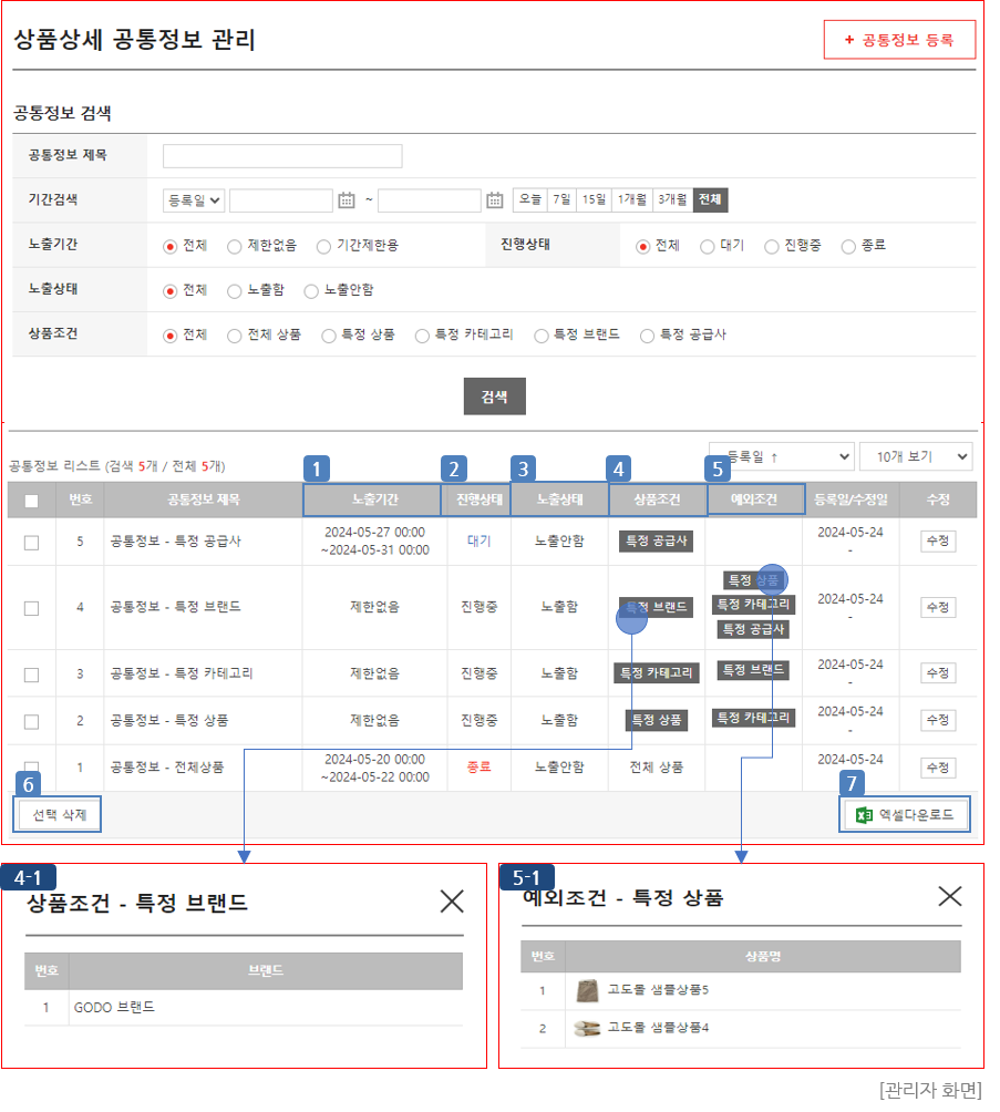 ⑤ 예외조건 : 상품상세 공통정보가 노출되지 않는 예외조건을 확인할 수 있습니다.