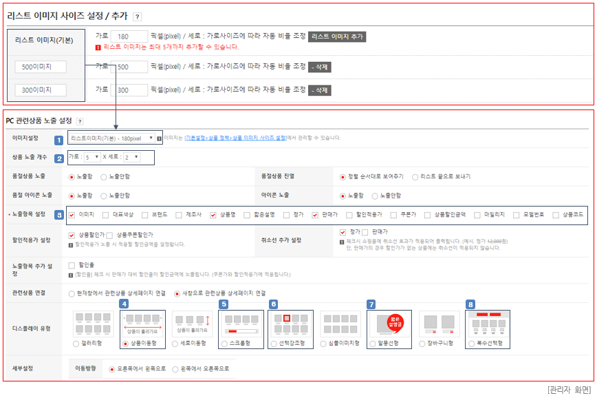- PC쇼핑몰 상품 상세페이지 하단에 노출되는 관련상품의 진열방법 및 노출방법을 설정할 수 있습니다.