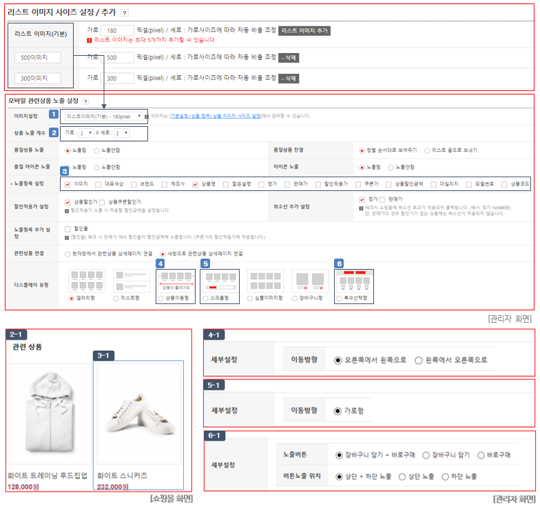 : 모바일쇼핑몰 상품 상세페이지 관련상품 진열영역에 노출할 상품의 디스플레이 유형을 설정할 수 있습니다.