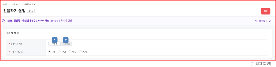 ① [사용함] : 선물하기를 활성화 할 수 있습니다. 선택 시, 하단에 선물하기 설정 메뉴들이 노출됩니다.