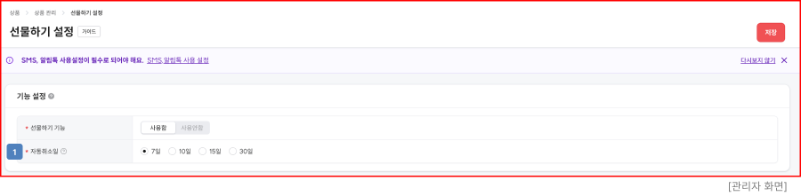 - "상품 > 상품 관리 > 선물하기 설정" 메뉴로 이동해, 선물하기 설정을 할 수 있습니다.