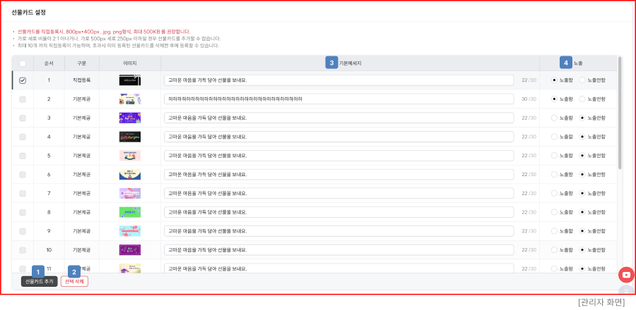 - 선물카드는 기본 20종이 제공되며, 최대 10개 이미지를 추가등록할 수 있습니다.