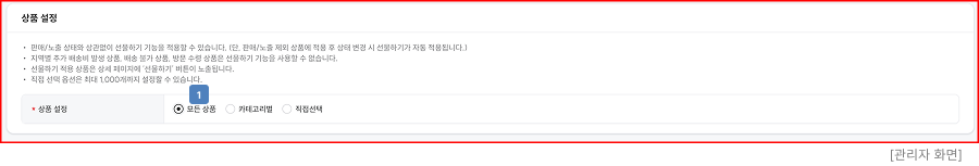 ① [모든 상품] : 선택시, 상점에 등록된 모든 상품에 일괄 적용할 수 있습니다. 선물 상품 설정 조건에 맞는 상품에만 적용됩니다.