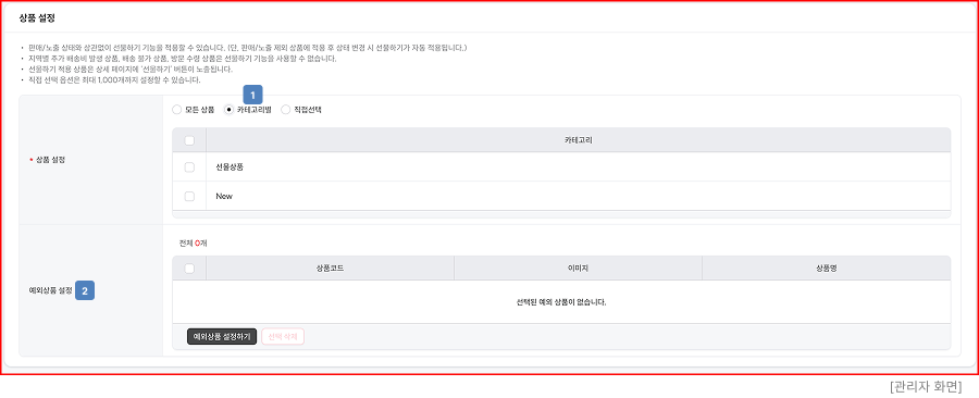 ② [예외상품 설정] : 선택한 카테고리에서 선물하기 기능을 제외하고 싶은 상품을 선택할 수 있습니다.