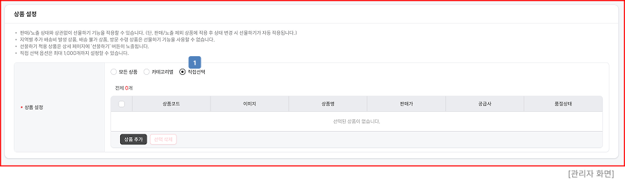 - "공급사 > 공급사 상품관리 > 상품 승인 관리" 의 상품 승인상태가 [승인완료] 인 상품만 설정 가능