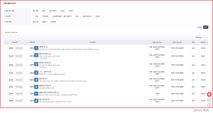 - "CRM > 메시지 설정 > 모바일 메시지 설정" 에서 SMS(또는 카카오 알림톡) 설정을 완료하고, 발송 건수를 충전해야 선물메시지가 자동 발송됩니다.