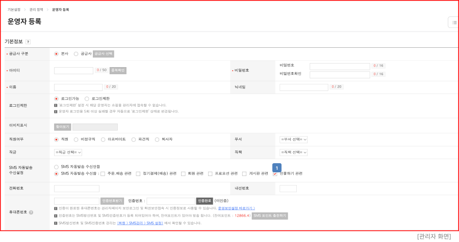 - 운영진이 선물하기 관련 메세지 수신하려면, "기본 설정 > 관리 정책 > 운영자 권한 등록/수정 > SMS 자동알림 수신설정" 에서 "선물하기 관련" 설정이 필요합니다.