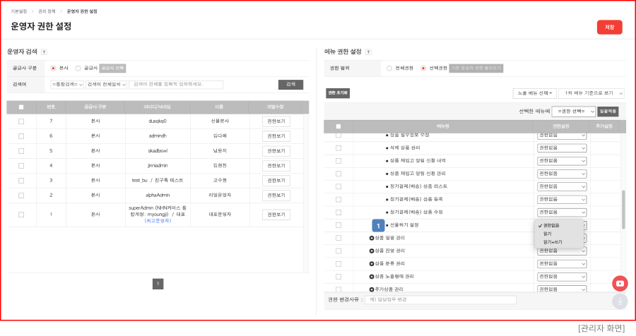 - 운영진이 선물하기 기능을 설정하려면, "기본 설정 > 관리 정책 > 운영자 권한 설정" 에서 메뉴 권한 설정이 필요합니다.